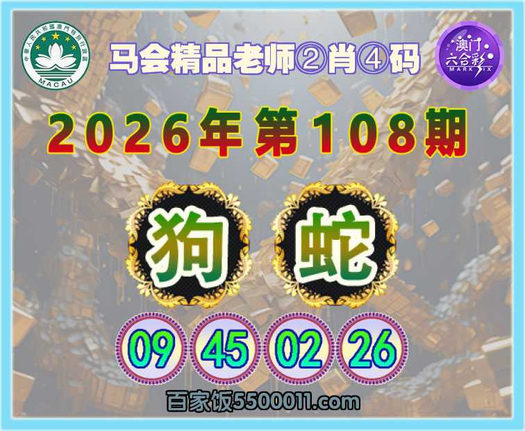 108期:【马会精品老师】 🍎②肖④码🍎【蛇】【09.45.02.26】开:狗45
